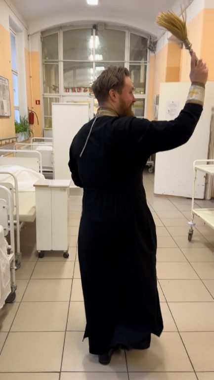 Освятил палаты, кабинеты врачей, отделения реанимации. С 14:00 до 17:00 пациенты и персонал больницы могли набрать святой воды.