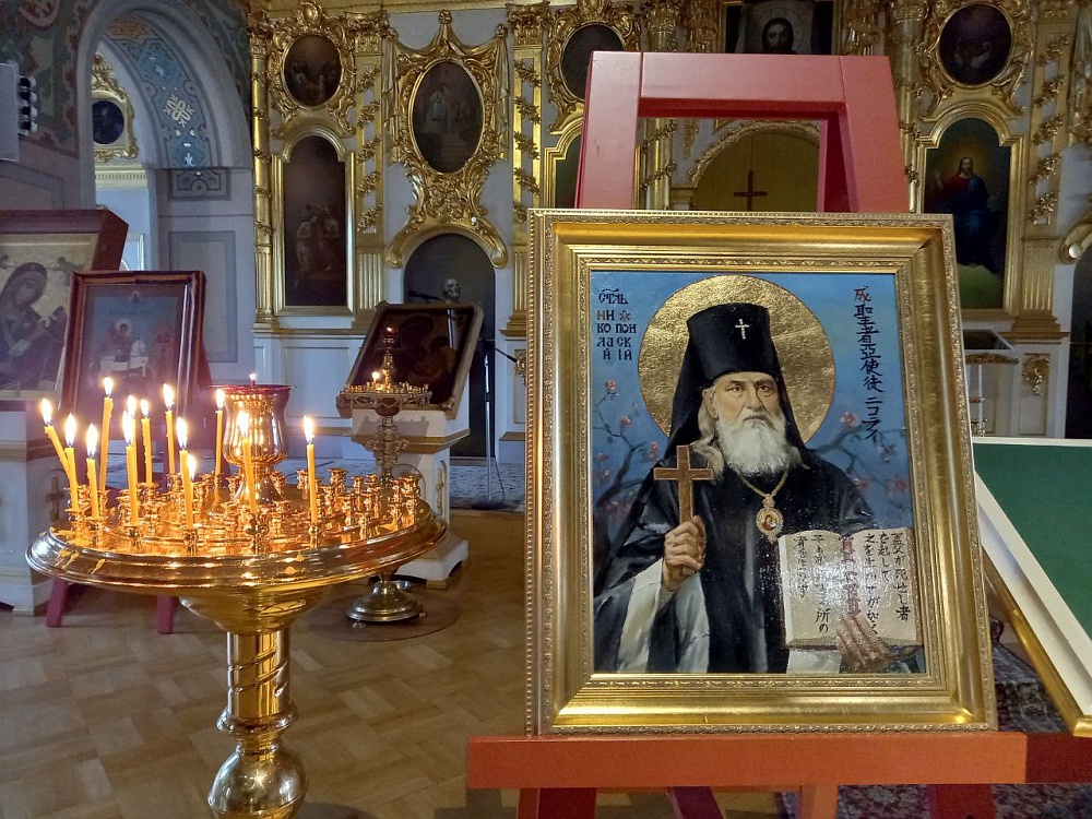 Настоятель отметил, что в Петербурге лишь несколько храмовых образов равноапостольного Николая Японского: в Воскресенском Новодевичьем монастыре, в Санкт-Петербургской Духовной Академии и в Благовещенском храме на Васильевском острове (до сего дня в храме находится еще икона Божией Матери с предстоящими святителями Николаем Японским и Тихоном Задонским).