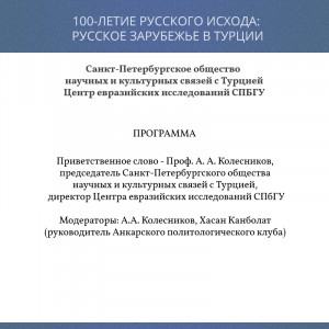 В субботу 31 октября приглашаем на международный круглый стол «100-летие Русского исхода: русское зарубежье в Турции». Мероприятие организовано Санкт-Петербургским обществом научных и культурных связей с Турцией и Центром евразийских исследований СПбГУ.