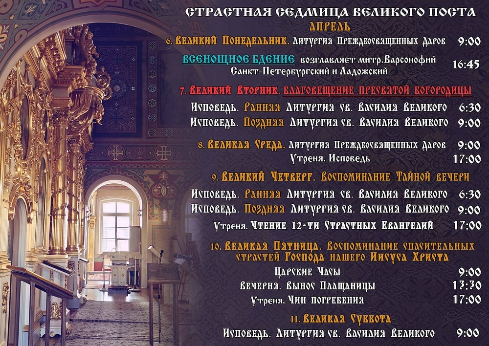 Расписание богослужений на Страстную седмицу, с 6 по 11 апреля. Посмотреть расписание.
