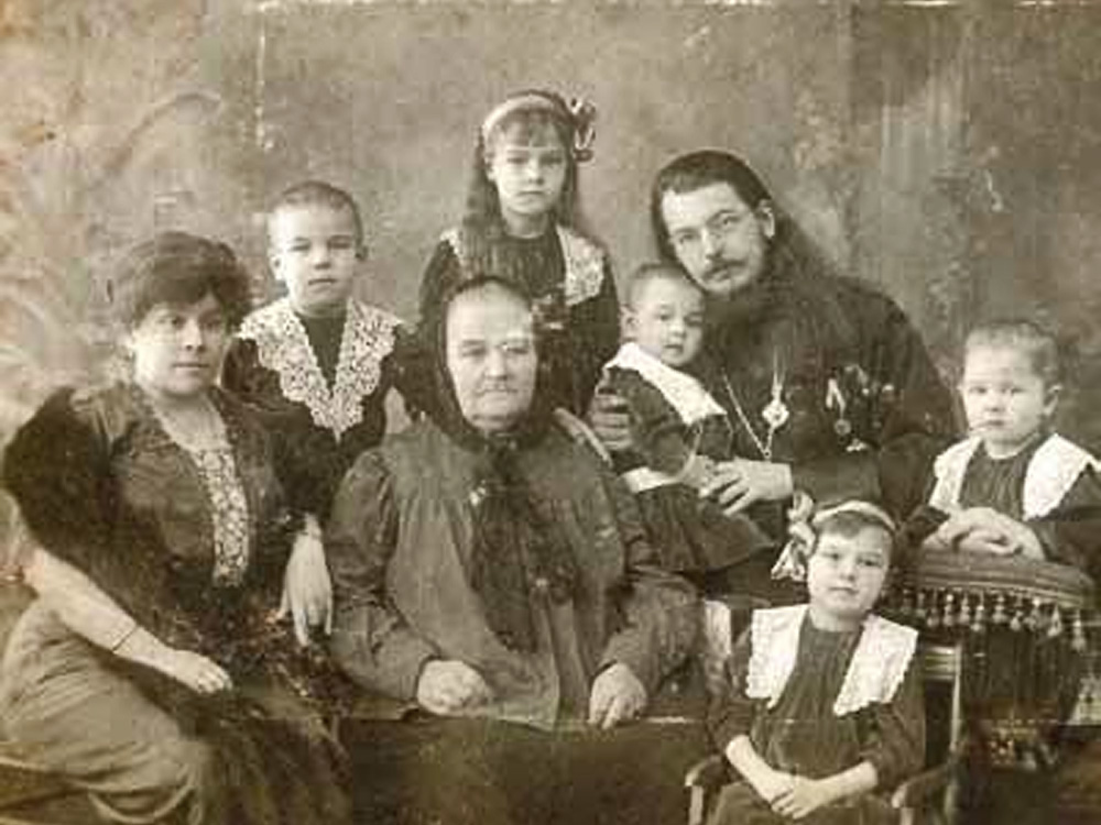 Протоиерей Иоанн Тихомиров с матерью Александрой Васильевной, женой Анной Васильевной и детьми